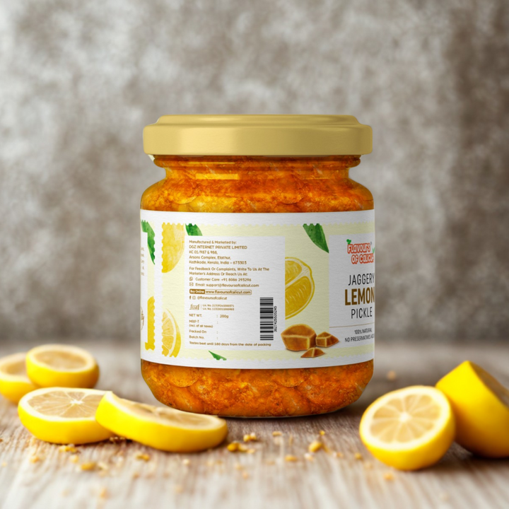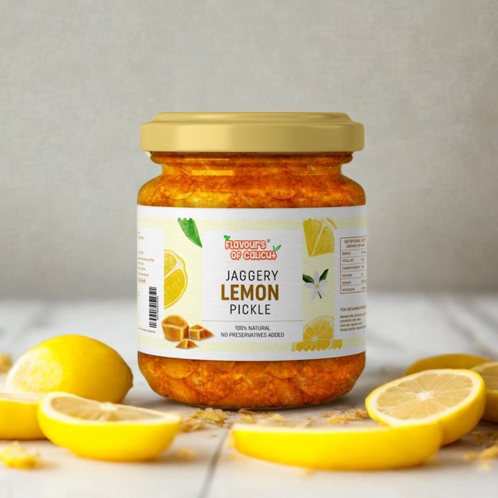 Flavours of Calicut Jaggery Lemon Pickle offers a sweet and spicy twist to the traditional lemon pickle. Made from fresh lemons and gently spiced with a blend of Kerala-style masalas, this oil-free pickle is elevated with a touch of jaggery that beautifully balances the tartness.