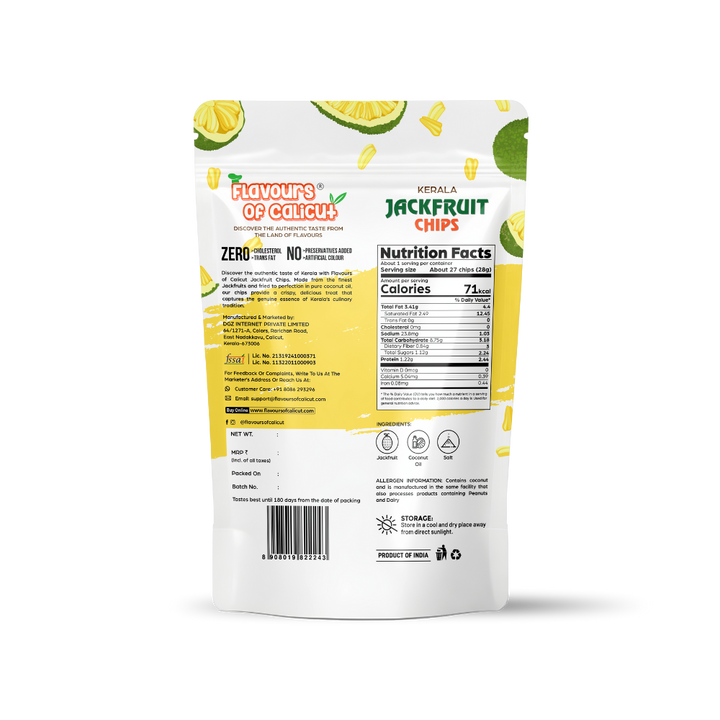 Flavours of Calicut Jackfruit Chips bring the wholesome richness of Kerala's favourite fruit straight to your snack bowl. Made from handpicked jackfruits and fried in pure coconut oil, these golden crisps are a perfect balance of taste and nutrition.